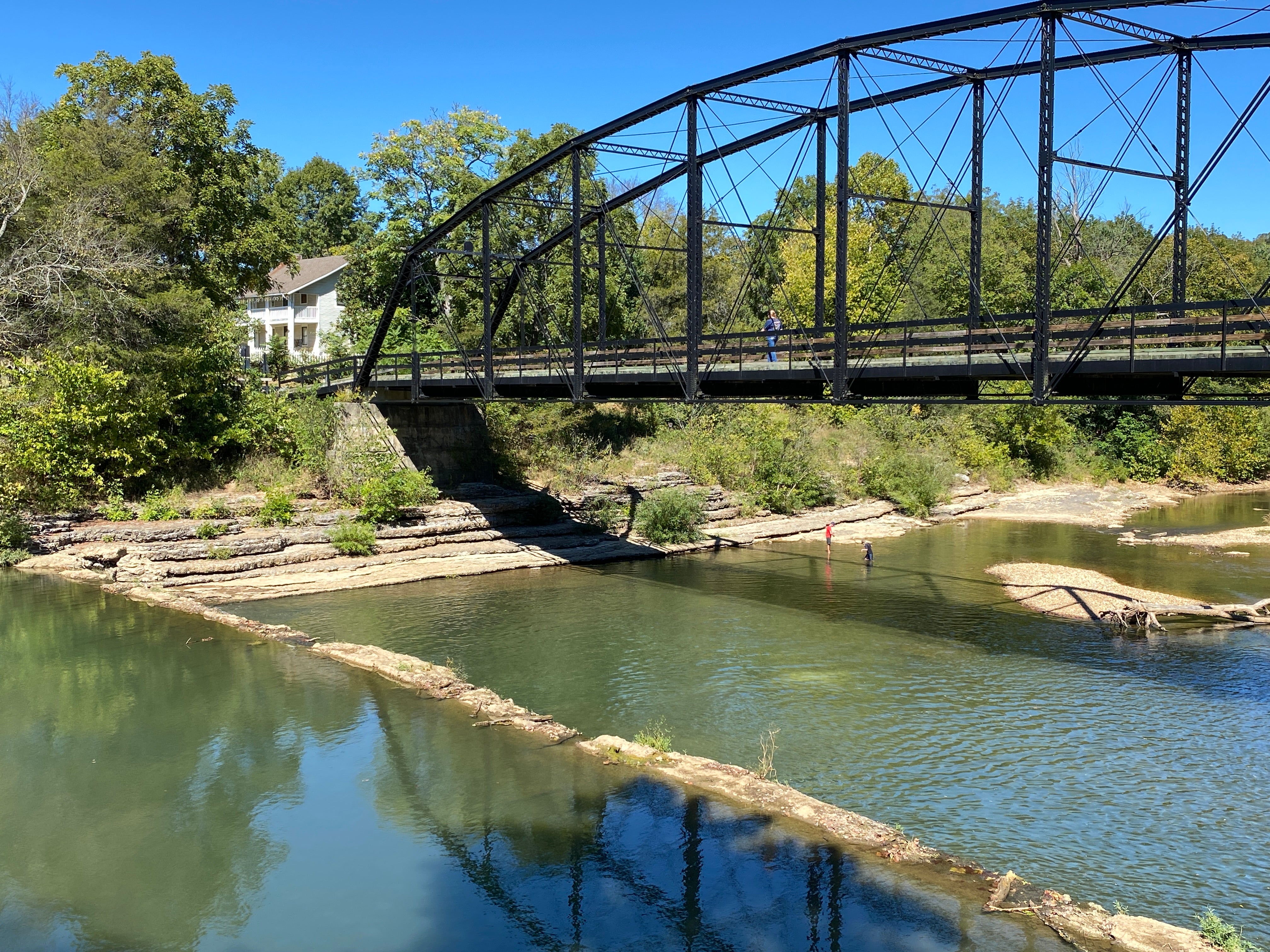 Cars and pedestrians share the bridge and anglers love fishing beneath it. Folks enjoy wading in the water here as well.